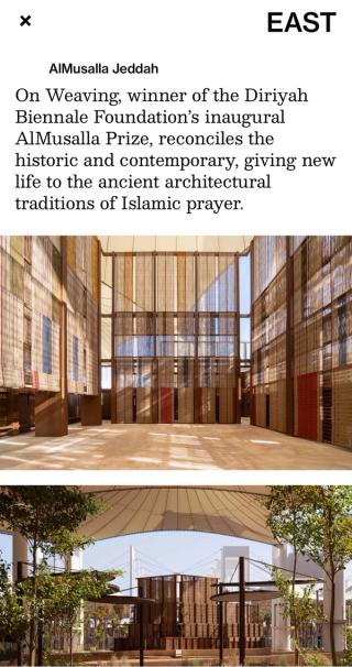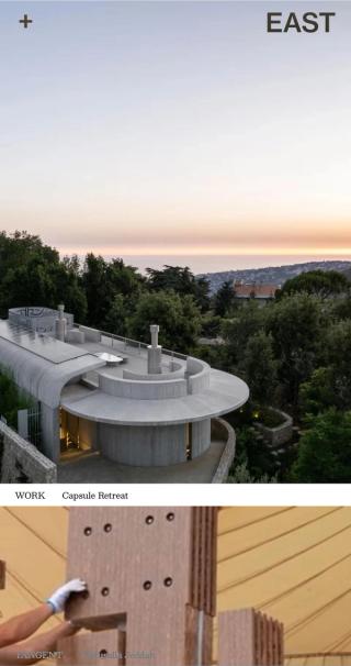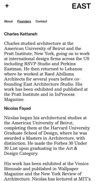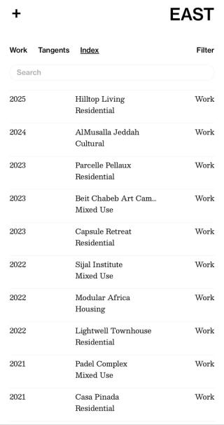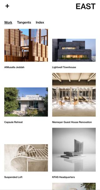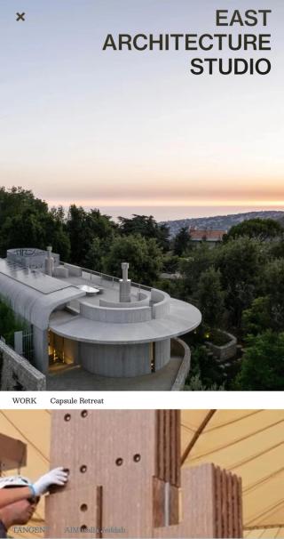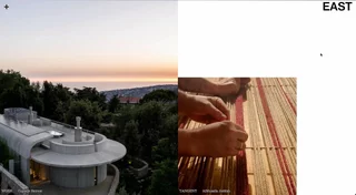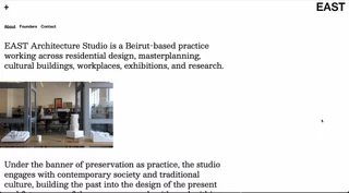 The studio’s name becomes pivotal to the site’s playful, typographic navigation. EAST (the abbreviation) expands into EAST ARCHITECTURE STUDIO, which acts as a title, description and also forms the site’s structure. Content is divided into Architecture and Studio, with EAST taking the user back to the landing page.